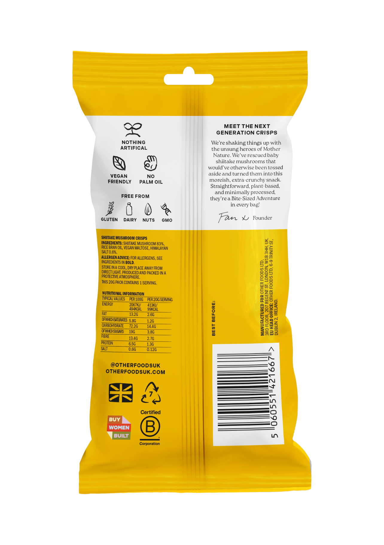 • The raw materials for our artichoke chips is certified organic however the whole range of Other Foods is not certified organic. However, we are always working to source the highest quality ingredients for our range of snacks.